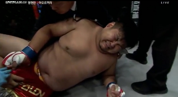 중국의 이종격투기 선수 아오르꺼러가 명현만과의 무제한급 매치에서 급소를 타격당해 부상을 입었다.