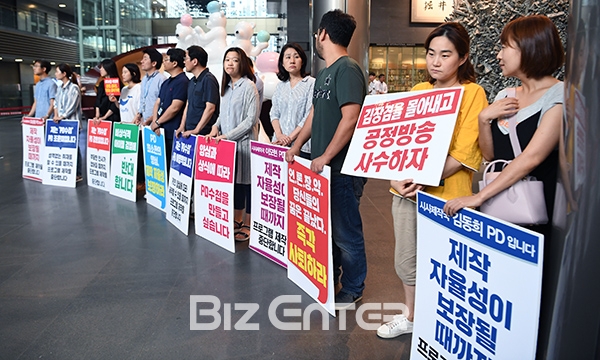 ’PD수첩’, ‘시사매거진2580’ 제작진들이 11일 오후 서울 마포구 상암동 MBC 사옥 로비에서 릴레이 피켓 시위를 진행하고 있다.