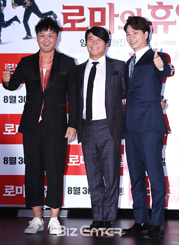 배우 공형진, 임창정, 정상훈(왼쪽부터)이 24일 오후 서울 중구 동대문 메가박스에서 열린 영화 '로마의 휴일'(감독 이덕희) 언론시사회에 참석해 포즈를 취하고 있다.