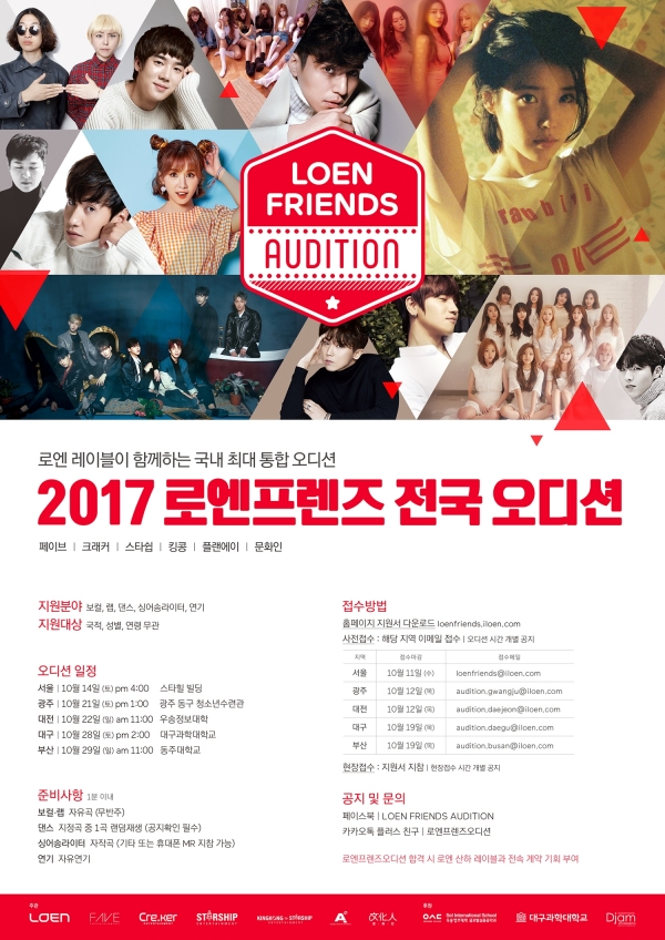 로엔엔터터엔먼트에서 전국 규모의 통합 오디션을 마련하는 것은 이번이 처음이다. 15일부터 공식 홈페이지를 접수를 받고, 10월 14일 서울을 시작으로 21일 광주, 22일 대전, 28일 대구, 29일 부산으로 행선지를 옮기면서 전국 각지에 숨어있는 원석을 발굴해나갈 예정이다.