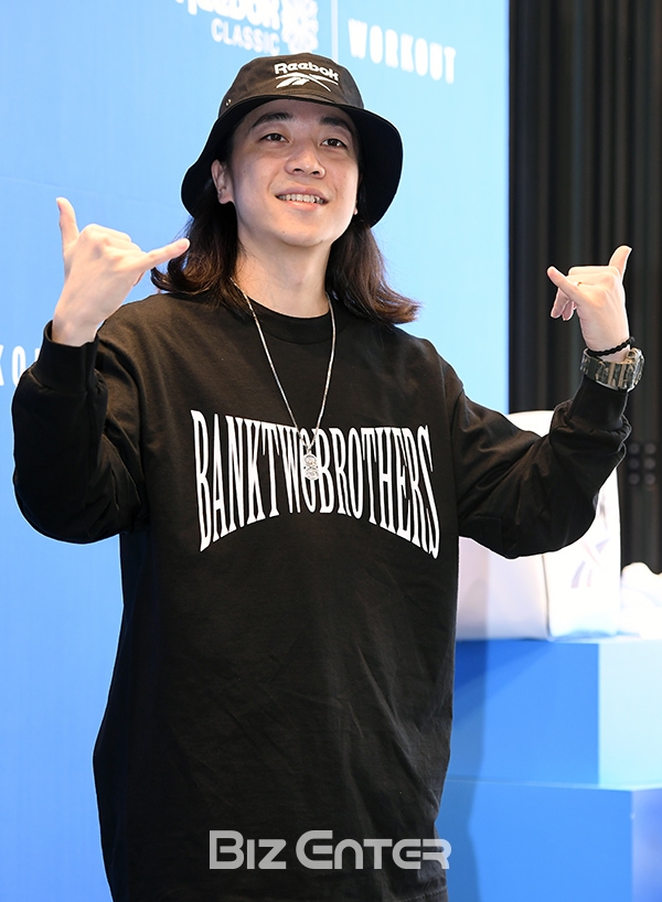 래퍼 넉살이 16일 오후 서울 강남 핫티 매장에서 열린 리복 클래식 ‘워크아웃(Workout)’ 리뉴얼 출시 기념 행사에 참석해 포즈를 취하고 있다.