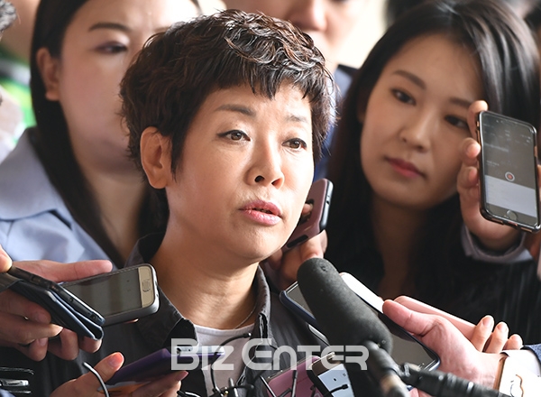 개그우먼 김미화가 19일 오전 서울중앙지방검찰청 국정원 수사팀에 참고인 신분으로 피해자 조사를 위해 출석해 취재진의 질문에 답하고 있다.