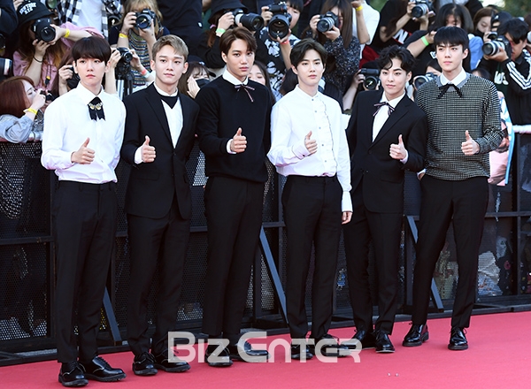 엑소(EXO)가 20일 오후 서울 잠실 학생실내체육관에서 열린 ‘2017 제 1회 소리바다 베스트 케이뮤직 어워즈(2017 1st SORIBADA BEST K-MUSIC AWARDS)’ 레드카펫 행사에 참석해 포즈를 취하고 있다.