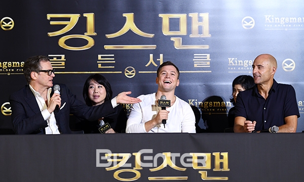 배우 콜린 퍼스, 태런 에저튼, 마크 스트롱이 21일 오전 서울 용산구 이촌동 CGV용산아이파크몰에서 열린 영화 '킹스맨: 골든 서클'(감독 매튜 본) 내한 기자회견에 참석해 질문에 답하고 있다.