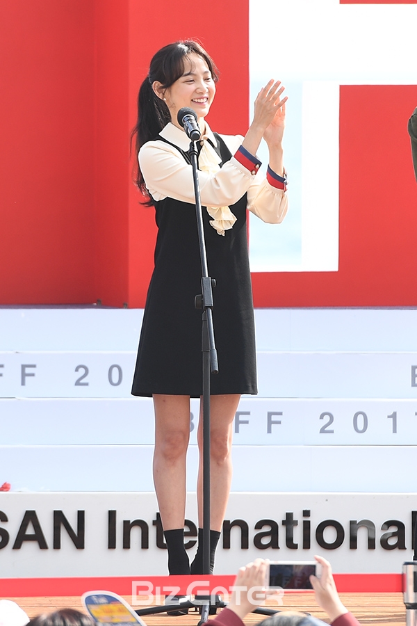 배우 윤승아가 13일 오후 부산광역시 해운대구 중동 비프빌리지에서 열린 '제22회 부산국제영화제' 영화 '메소드' 무대인사에 참석해 관객들과 만남을 갖고 있다.