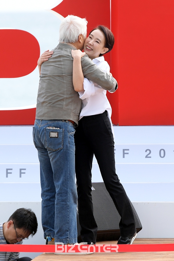 배우 신성일이 14일 오후 부산광역시 해운대구 중동 비프빌리지에서 열린 '제22회 부산국제영화제(BIFF, 이하 부국제)’ 핸드프링팅 행사에 참석해 강수연 집행위원장과 인사를 나누고 있다.