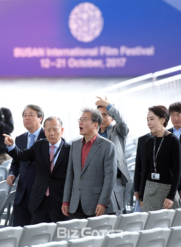 ‘제22회 부산국제영화제’(BIFF, 이하 부국제)를 방문한 문재인 대통령이 김동호 조직위원장, 강수연 집행위원장과 함께 15일 오후 부산 해운대구 우동 영화의전당 야외극장을 둘러보고 있다.