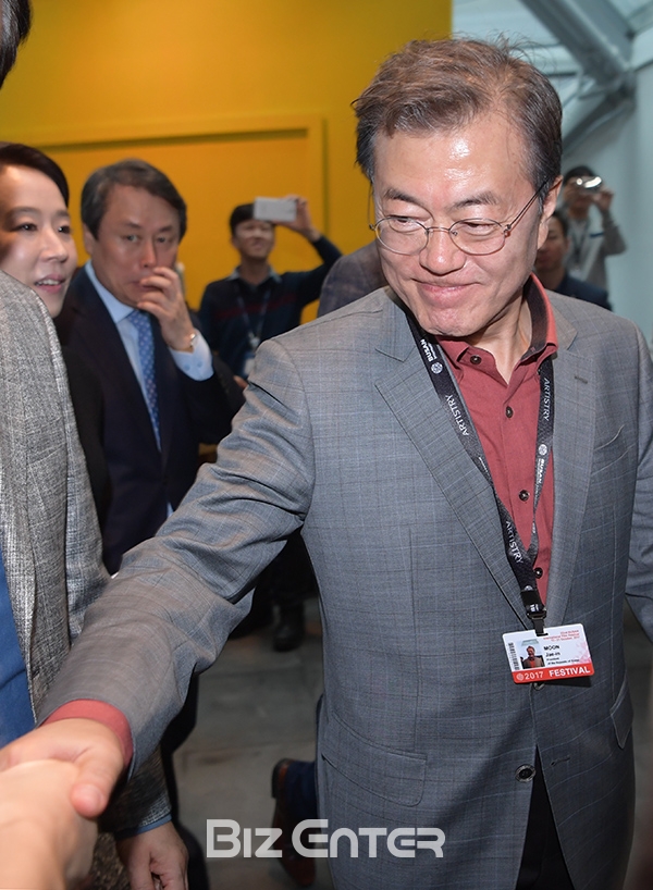 [BZ포토] 문재인 대통령, 악수 건네며 인자한 미소