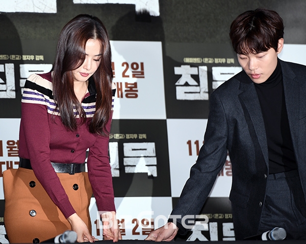 배우 이하늬, 류준열이 24일 오후 서울 CGV 용산점에서 열린 영화 '침묵'(감독 정지우) 언론시사회에 참석해 자리에 착석하고 있다.