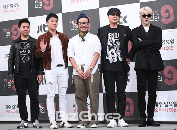 유성모 PD, 빅뱅 승리, 한동철 PD, 양현석 대표, 자이언티가 27일 오후 서울 강남구 논현동 임피리얼 팰리스 호텔에서 열린 JTBC ‘믹스나인’(연출 한동철, 유성모, 이상윤 등) 제작발표회에 참석해 포즈를 취하고 있다.