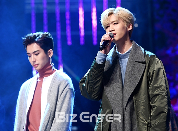 펜타곤 유토, 옌안이 22일 오후 서울 용산구 한남동 블루스퀘어 아이마켓홀에서 열린 펜타곤 다섯 번째 미니앨범 ‘데모_02(DEMO_02)’ 발매 쇼케이스에서 무대를 펼치고 있다.