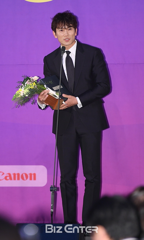 배우 지성이 8일 오후 서울 영등포구 여의도 KBS 신관홀에서 열린 ‘2017 그리메상 시상식’에서 최우수남자연기자상 수상 후 소감을 전하고 있다.