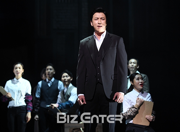 배우 박건형, 앙상블이 12일 오후 서울 중구 충무아트센터 대극장에서 열린 뮤지컬 ‘모래시계’ 프레스콜에 참석해 극 중 한 장면을 선보이고 있다.