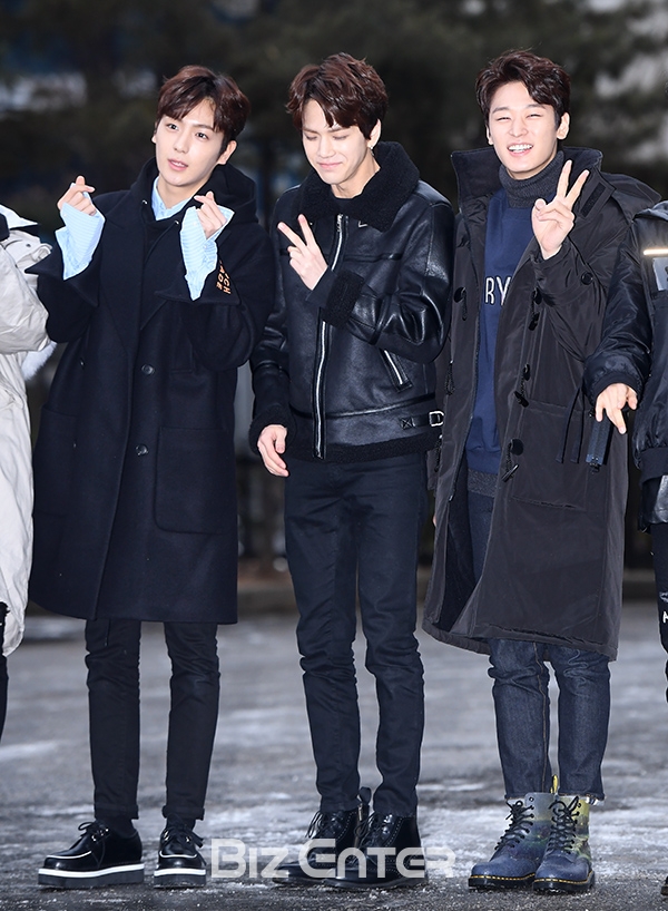 더보이즈 현재, 영훈, 주연이 22일 오전 서울 영등포구 여의도 KBS 신관 공개홀에서 열린 KBS 2TV '뮤직뱅크'(뮤뱅) 리허설에 참석하기 위해 방송국으로 들어서 인사를 하고 있다.