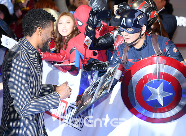 배우 채드윅 보스만이 5일 오후 서울 영등포 타임스퀘어 아트리움에서 열린 영화 ‘블랙팬서’(감독 라이언 쿠글러) 아시아 프리미어 레드카펫 행사에 참석해 사인을 하고 있다.