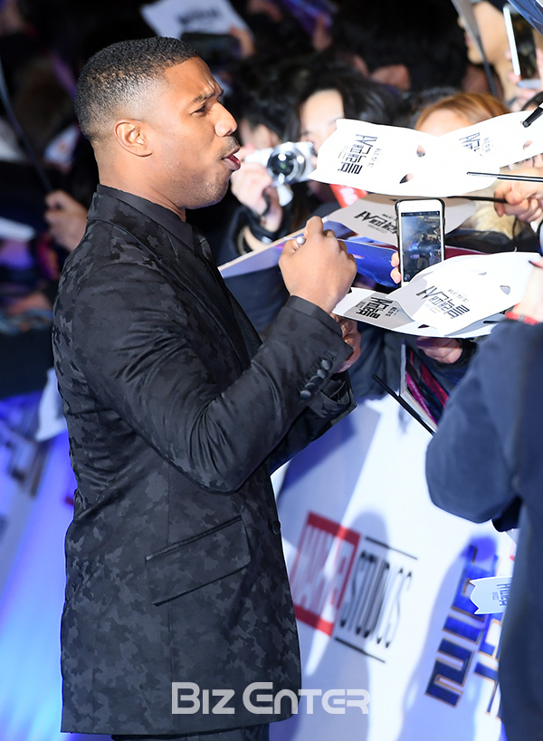 배우 마이클B. 조던 5일 오후 서울 영등포 타임스퀘어 아트리움에서 열린 영화 ‘블랙팬서’(감독 라이언 쿠글러) 아시아 프리미어 레드카펫 행사에 참석해 사인을 하고 있다.