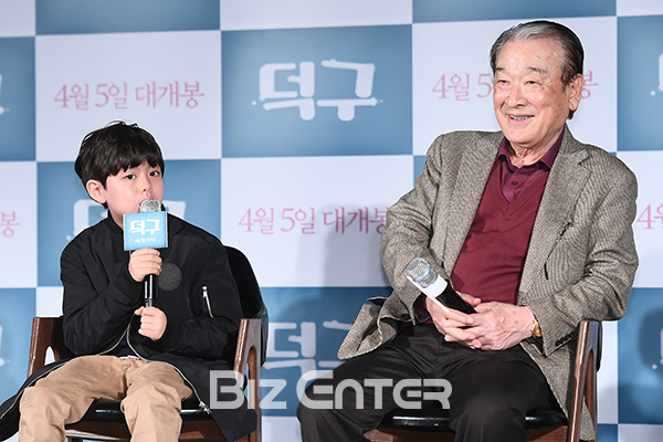 배우 정지훈, 이순재가 14일 오전 서울 중구 메가박스 동대문에서 열린 영화 ‘덕구’(감독 방수인) 제작보고회에 참석해 질문에 답하고 있다.