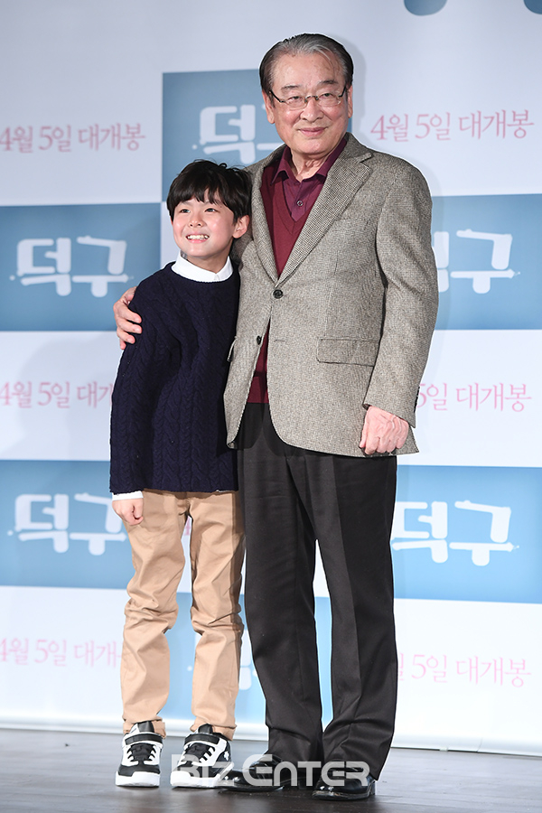 배우 정지훈, 이순재가 14일 오전 서울 중구 메가박스 동대문에서 열린 영화 ‘덕구’(감독 방수인) 제작보고회에 참석해 포즈를 취하고 있다.