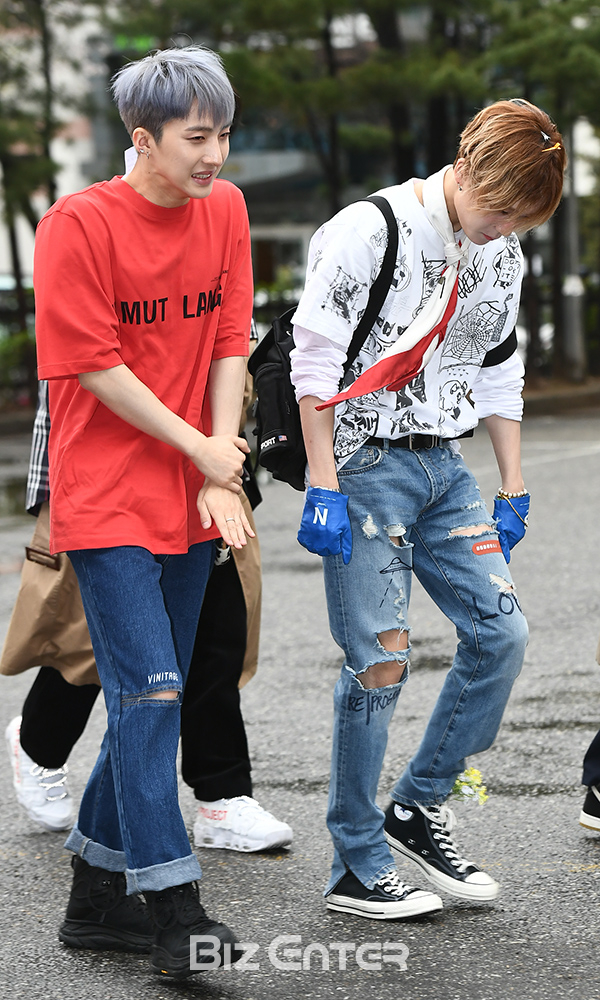 펜타곤 후이, 이던이 6일 오전 서울 영등포구 여의도 KBS홀에서 열린 KBS 2TV ‘뮤직뱅크’ 리허설에 참석하기 위해 방송국으로 출근하고 있다.