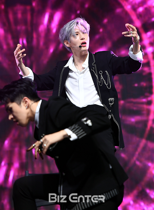빅스 레오가 17일 오후 서울 광진구 예스24 라이브홀에서 열린 빅스 세 번째 정규앨범 ‘오드빅스(EAU DE VIXX)’ 발매 쇼케이스에서 무대를 선보이고 있다.