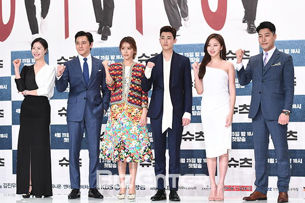 배우 진희경, 장동건, 채정안, 박형식, 고성희, 최귀화가 23일 오후 서울 영등포 타임스퀘어 아모리스홀에서 열린 KBS 2TV 수목드라마 ‘슈츠(Suits)’(극본 김정민, 연출 김진우) 제작발표회에 참석해 포즈를 취하고 있다.