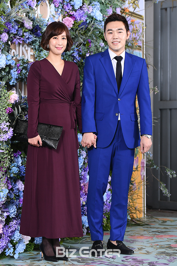 배우 오주은, 개그맨 문용현 부부가 26일 오후 서울 성동구 성수이로 140에서 열린 에이바이봄X하우스오브콜렉션스 전시 기념 행사에 참석해 포즈를 취하고 있다.
