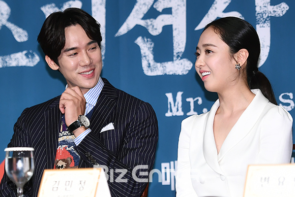배우 유연석, 김민정이 26일 오후 서울 강남구 파티오나인에서 열린 tvN 주말드라마 ‘미스터 션샤인’(극본 김은숙, 연출 이응복) 제작발표회에 참석해 질의응답 시간을 갖고 있다.