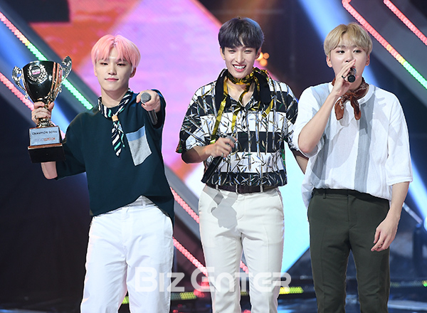 세븐틴 디노, 도겸, 승관이 25일 오후 경기 고양시 일산MBC드림센터에서 열린 MBC뮤직 ‘쇼! 챔피언’(이하 ‘쇼챔’) 생방송에서 1위 챔피언송 수상 후 앙코르 무대를 펼치고 있다.