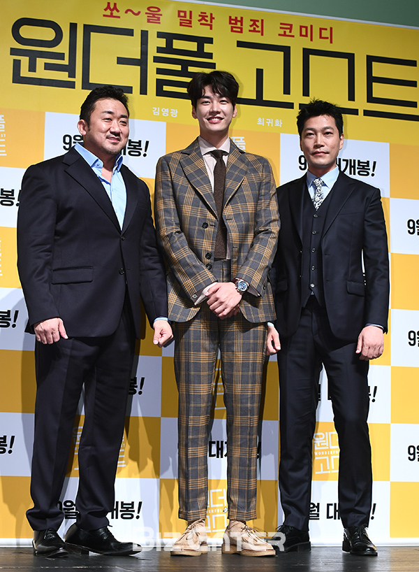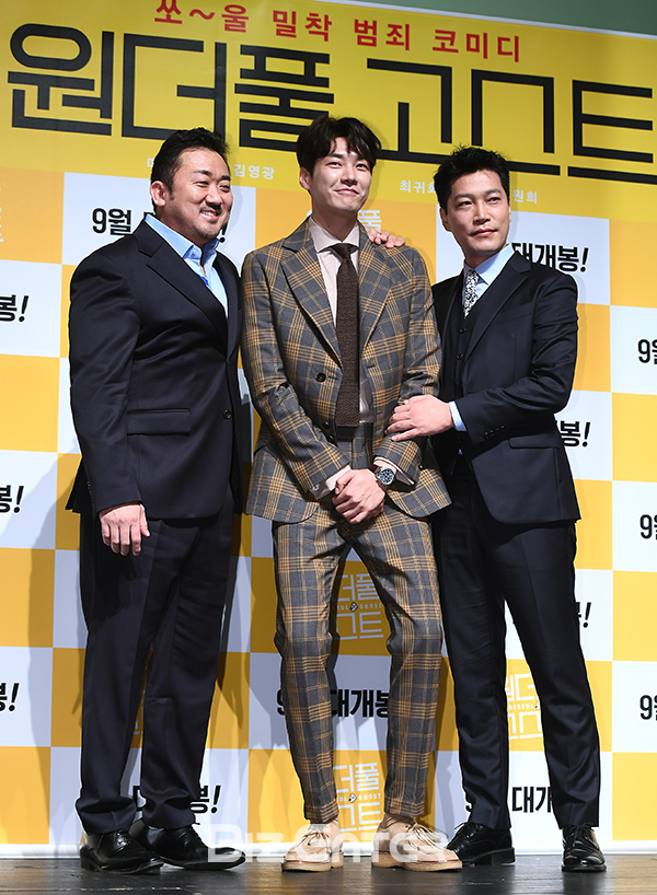 배우 마동석, 김영광, 최귀화가 29일 오전 서울 강남구 압구정CGV에서 열린 영화 ‘원더풀 고스트’(감독 조원희) 제작보고회에 참석해 포즈를 취하고 있다.