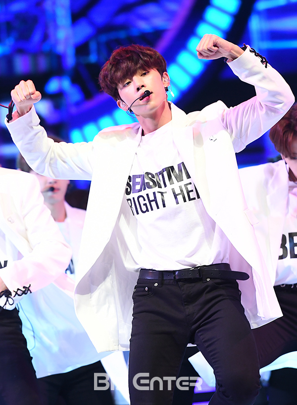 더보이즈 선우가 5일 오후 서울 광진구 세종대학교 대양홀에서 열린 더보이즈(THE BOYZ) 첫 싱글앨범 '더 스피어(THE SPHERE)' 발매 쇼케이스에서 무대를 선보이고 있다.