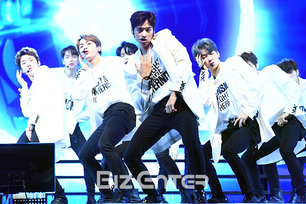 더보이즈가 5일 오후 서울 광진구 세종대학교 대양홀에서 열린 더보이즈(THE BOYZ) 첫 싱글앨범 '더 스피어(THE SPHERE)' 발매 쇼케이스에서 무대를 선보이고 있다.