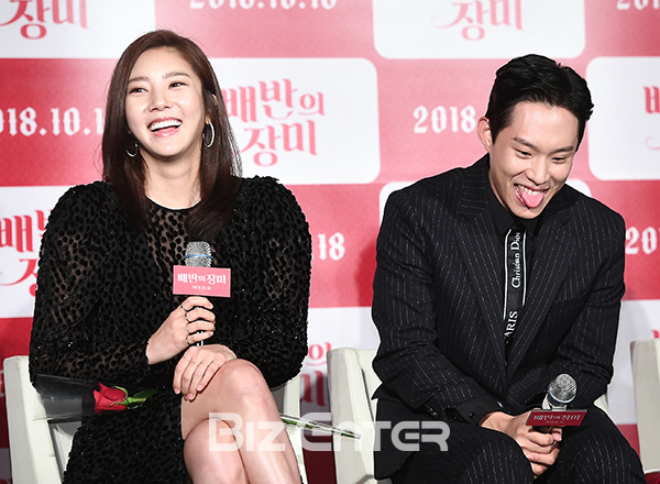 배우 손담비, 김성철이 20일 오후 서울 롯데시네마 건대입구에서 열린 영화 '배반의 장미’(감독 박진영) 제작보고회에 참석하고 있다.