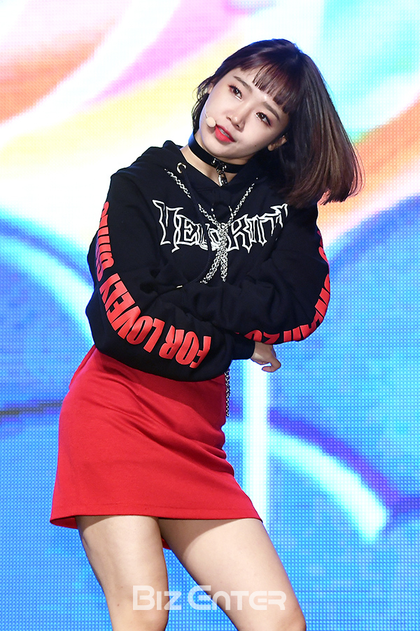 위키미키 최유정이 11일 오후 서울 용산구 블루스퀘어 아이마켓홀에서 열린 위키미키 첫 번째 싱글앨범 ‘키스, 킥스(KISS, KICKS)’ 발매 쇼케이스에서 무대를 선보이고 있다.