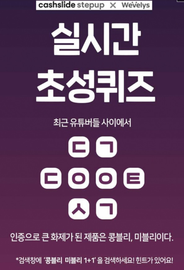 캐시슬라이드는 “최근 유투버들 사이에서 ‘ㄷㄱㄷㅇㅇㅌㅅㄱ’ 인증으로 큰 화제가 된 제품은 콩블리, 미블리이다”라며 ‘ㄷㄱㄷㅇㅇㅌㅅㄱ’의 초성을 묻는 퀴즈를 출제했다.