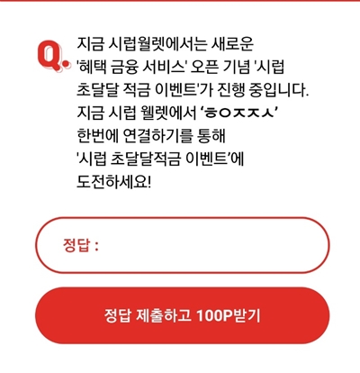 23일 OK캐쉬백 앱을 통해 "지금 시럽월렛에서는 새로운 혜택 금융 서비스 오픈 기념 시럽 초달달 적금 이벤트가 진행 중입니다. 지금 시럽 월렛에서 ㅎㅇㅈㅈㅅ 한번에 연결하기를 통해 시럽 초달달적금 이벤트에 도전하세요"라는 퀴즈가 출제됐다. 또 "네이버에서 ‘시럽 초달달 적금’을 검색하면 된다"고 힌트를 건넸다.
