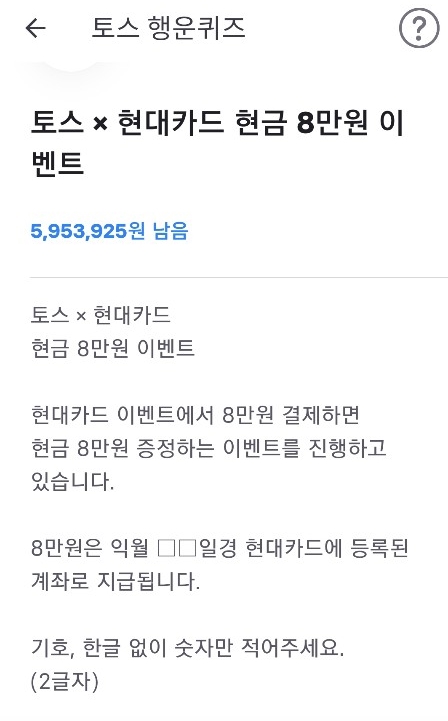 토스 행운 퀴즈 측은 24일 "토스 × 현대카드 현금 8만원 이벤트. 현대카드 이벤트 대상카드는 ‘현대카드 ZERO(□□□)’ 입니다. □에 들어갈 단어를 적어주세요"를 출제했다.