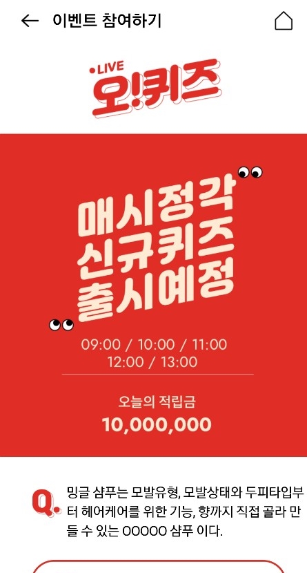'나만의 맞춤샴푸 밍글' 관련 11시 '오퀴즈'가 출제됐다.
