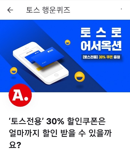 토스 행운 퀴즈 측은 "네이버에 '토스로 어서옥션' 검색 후, '[토스전용] 30% 할인쿠폰'의 '최대 할인 금액'을 참고하세요"라며 힌트를 제시했다.