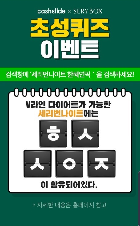 캐시슬라이드는 4일 “V라인 다이어트가 가능한 세리번나이트에는 ㅎㅅㅅㅇㅈ이 함유되어 있다”라는 실시간 초성퀴즈를 냈다.