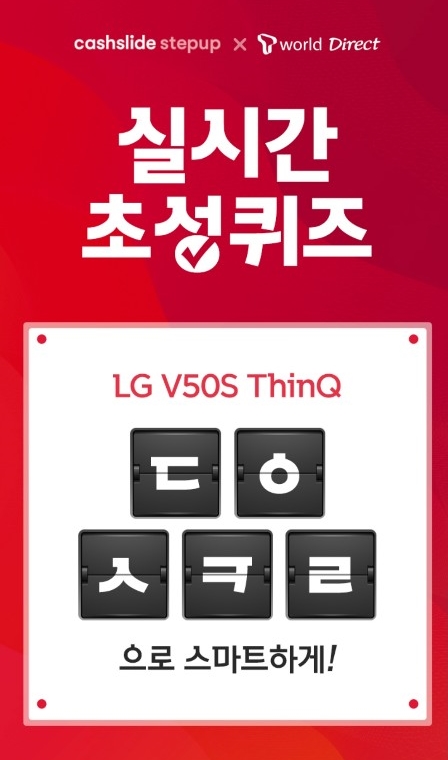 캐시슬라이드는 4일 "LG V50S ThinQ ㄷㅇㅅㅋㄹ으로 스마트하게"라는 실시간 초성퀴즈를 냈다.