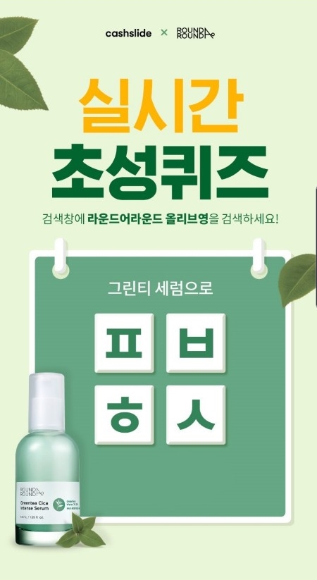 캐시슬라이드는 1일 올리브영과 함께 "그린티 세럼으로 ㅍㅂㅎㅅ"란 초성 퀴즈를 출제했다.