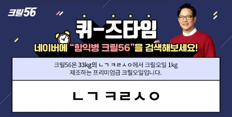 27일 출제된 '함익병 크릴56' 관련 퀴즈는 "크릴56은 33kg의 ㄴㄱㅋㄹㅅㅇ에서 크릴오일 1kg을 제조하는 프리미엄급 크릴오일이다"이다. 이번 '함익병 크릴56' 퀴즈 정답은 '남극크릴새우'이다.