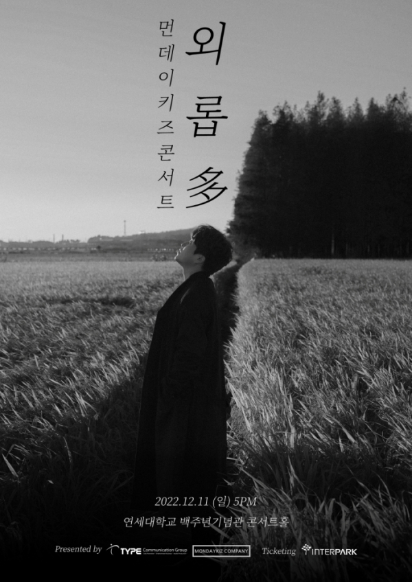 한편 2022 먼데이키즈 연말 콘서트 ‘외롭多’는 오는 12월 11일 오후 5시 연세대학교 백주년기념관 콘서트홀, 24일 오후 7시 인천문화예술회관 대공연장에서 진행된다. 서울 공연 티켓 예매는 온라인 예매사이트 인터파크 티켓을 통해 진행 중이며, 인천 공연 예매는 17일 오후 2시에 오픈된다.