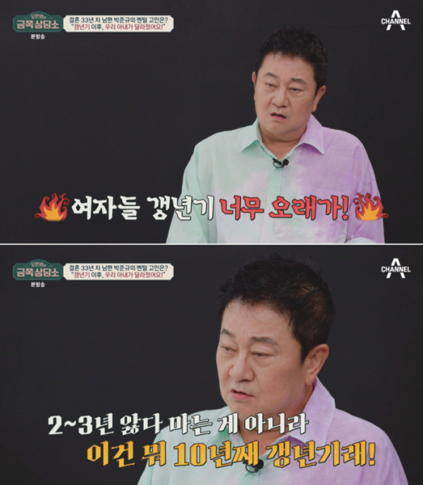 영원한 쌍칼 형님, 배우 박준규는 결혼 33년 차임에도 아내의 손을 꼭 잡고 등장해 사랑꾼 남편의 면모를 보인다. 그러나 훈훈함도 잠시, 박준규는 “아내에게 사기 결혼 당했다”며 천사 같던 아내가 갱년기 이후 180° 돌변했다고 털어놓는다. 이어 ‘철딱서니 없다’는 말 한마디에 부부 전쟁을 치른 일화를 밝히며 “10년째 갱년기라는데 말이 되냐”고 쌓아왔던 답답함을 토로한다.