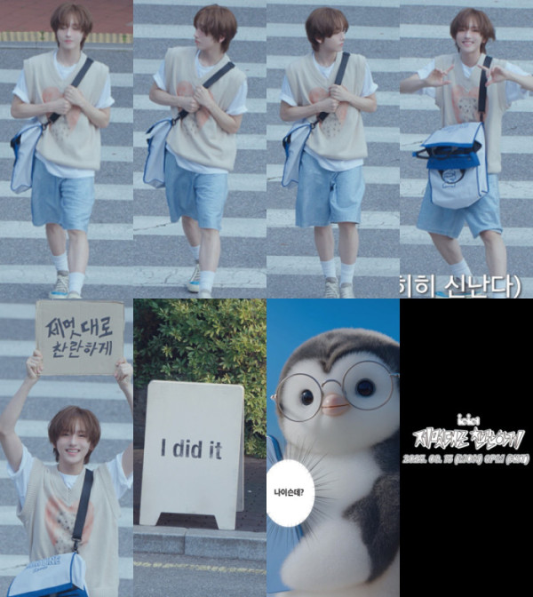 영상은 막내 정세민이 건널목에서 즉흥적으로 춤을 추는 장면을 시작으로, 크로스백에서 꺼낸 홍보 피켓, 도로변의 앨범 입간판, 펭귄 캐릭터 말풍선 등 예측 불가능한 연출이 이어지며 경쾌한 분위기를 자아냈다. 꾸밈없는 사복 패션과 자연스러운 촬영 방식이 어우러져 청량하면서도 유쾌한 무드를 전했다.