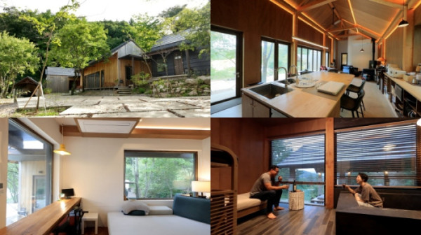 부엌과 거실 등 공용공간을 겸한 카페동, 집 짓기 전 땅에 익숙해지기 위해 1년간 장박한 자리에 지은 부부의 보금자리인 주인동, 또한 지인들과 가끔 놀러오는 바쁜 아들을 위한 손님동, 그리고 부부의 로망이 실현된 야외 공간까지. 부부는 자연을 지키기 위해 나무를 피해 집을 네 동으로 나눠서 지었다. 하지만 분리된 건물들 사이로 처마가 연결되어 있어 떨어져 있어도 하나의 생활공간처럼 동선이 연결되어 있다.