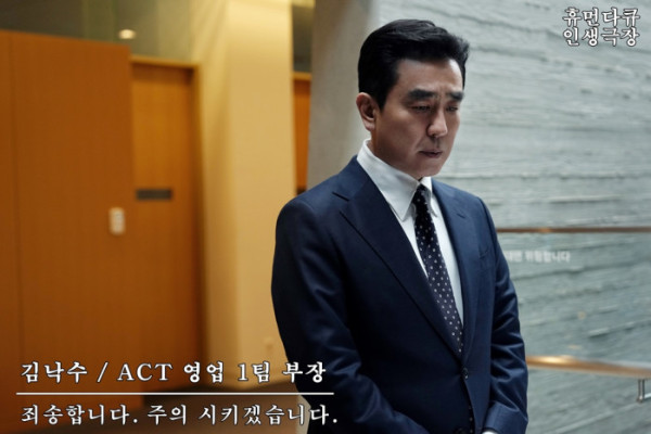 극 중 류승룡은 대기업 재직 25년차 영업 1팀 부장 김낙수 역을 맡았다. 김낙수는 ACT 기업 입사 후 발바닥에 땀 나게 뛰어다니며 열심히 살아온 끝에 서울 자가에 대기업 부장이라는 타이틀을 거머쥔 인물. 가정주부 아내와 명문대에 다니는 아들까지 겉으로 보기에는 남 부러울 것 없어 보이는 평탄한 삶을 살고 있다.