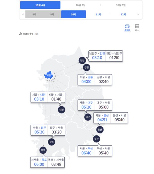 각 도시에서 서울까지 예상 소요 시간은 부산 5시간 40분, 울산 5시간 40분, 대구 5시간, 목포 3시간 48분, 광주 3시간 20분, 강릉 2시간 40분, 대전 1시간 40분, 양양 1시간 50분이다.