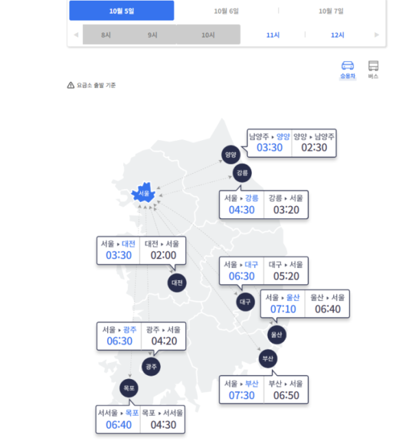 각 도시에서 서울까지 예상 소요 시간은 부산 6시간 50분, 울산 6시간 40분, 대구 5시간 20분, 목포 4시간 30분, 광주 4시간 20분, 강릉 3시간 20분, 대전 2시간, 양양 2시간 30분이다.