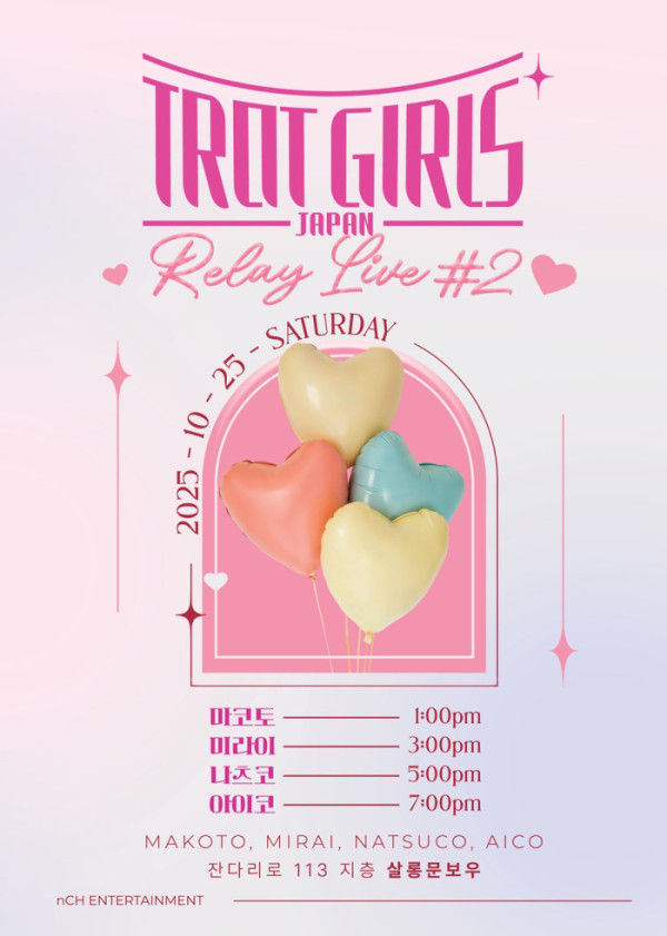 마코토(MAKOTO.), 후쿠다 미라이, 나츠코, 아이코까지 '트롯 걸즈 재팬' 멤버 4인이 출연하는 'TROT GIRLS JAPAN RELAY LIVE #2(트롯 걸즈 재팬 릴레이 라이브 #2)'가 오는 25일 오후 1시부터 서울 마포구 살롱문보우에서 열린다.